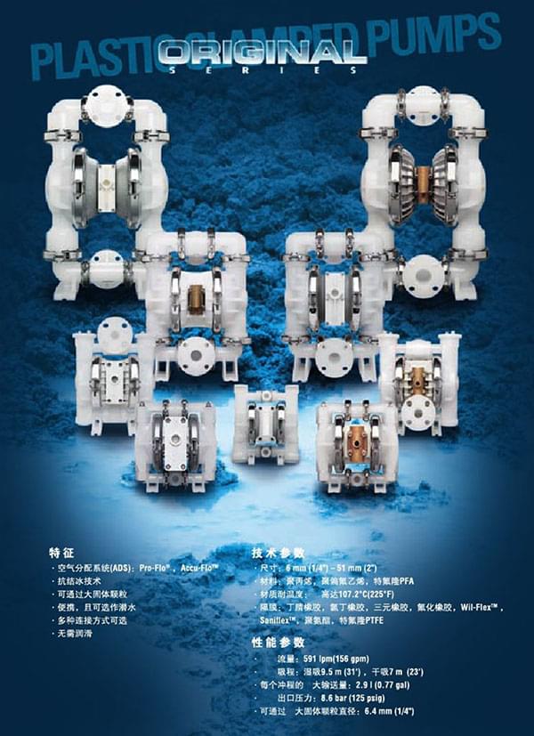 泵具有干吸能力,可輸送高粘度與高摩擦力的流體,可空轉而無危險性,并可通過34.9mm(13/8’)的粒徑。Wilden泵不需要使用高成本的馬達,可變動速度的驅動器。