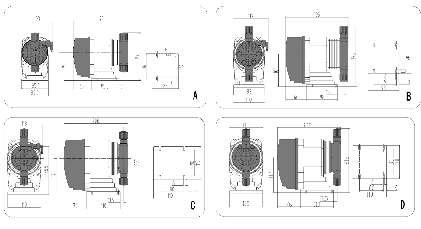 | DFD手動系列 | 型號 | 流量 | 壓力 | 沖程頻率 | 功率 | 外形尺寸 |