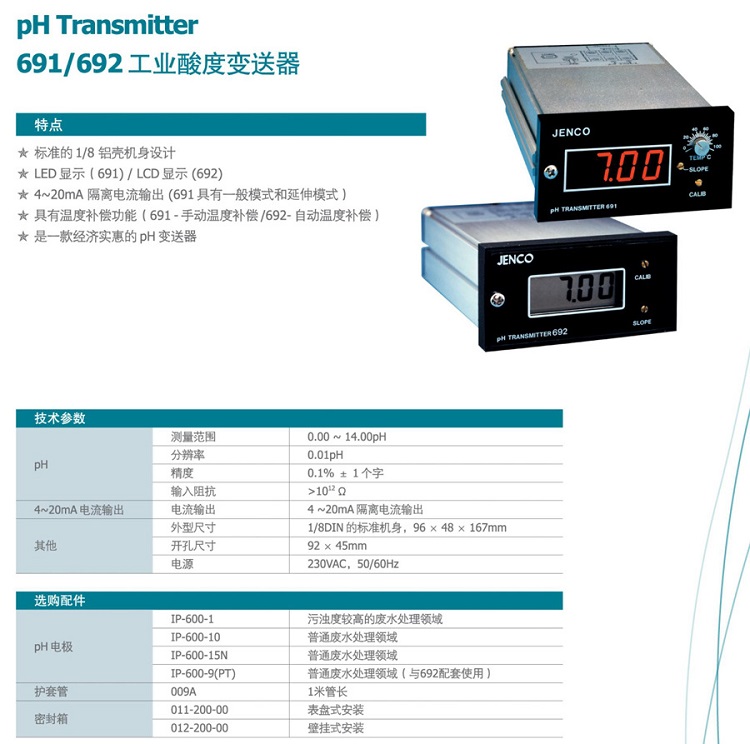 在線PH變送器692(套) JENCO/任氏工業PH酸度計 水質在線分析儀
