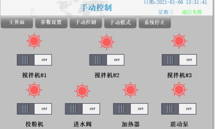 控制箱置于支架上,箱上各運轉(zhuǎn)設備及加熱件均設有“自動”與“手動”檔,當打至“手動”時,相應部分可由人工控制;打至“自動”時,則進入自動運行。若某設備出現(xiàn)故障時,則會報警,提醒用戶進行處理或檢修。
