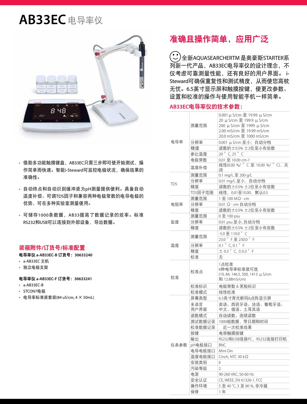 奧豪斯電導率儀AB33EC實驗室電導率測試儀AB23EC數顯電導率分析儀