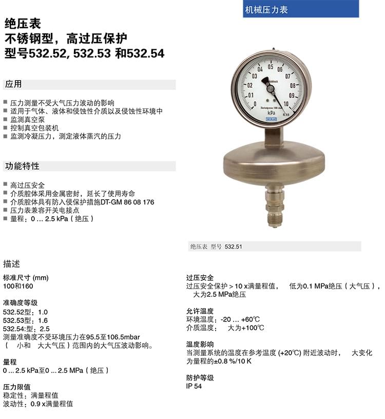 3. 絕壓表,帶有膜片,CrNi-不銹鋼制造結(jié)構(gòu)壓力表:516.11 516.12 532.51 532 .52 532.53 532.54