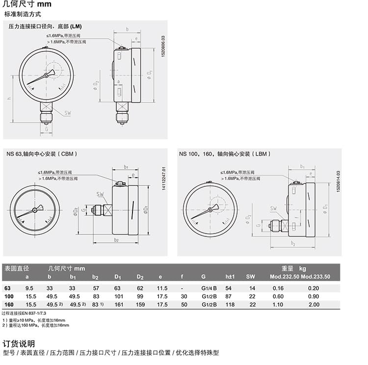 表圓直徑160mm:0...0.06至0...160MPa